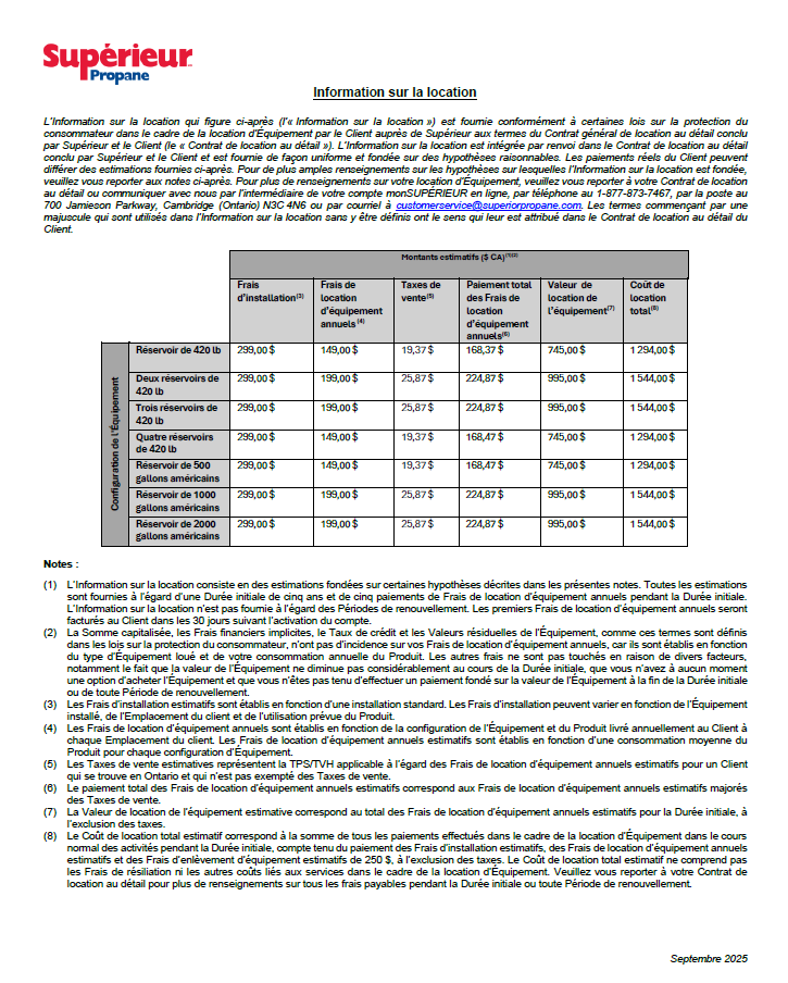 L’Information sur la location qui figure ci-après (l’« Information sur la location ») est fournie conformément à certaines lois sur la protection du consommateur dans le cadre de la location d’Équipement par le Client auprès de Supérieur aux termes du Contrat général de location au détail conclu par Supérieur et le Client (le « Contrat de location au détail »). L’Information sur la location est intégrée par renvoi dans le Contrat de location au détail conclu par Supérieur et le Client et est fournie de façon uniforme et fondée sur des hypothèses raisonnables. Les paiements réels du Client peuvent différer des estimations fournies ci-après. Pour de plus amples renseignements sur les hypothèses sur lesquelles l’Information sur la location est fondée, veuillez vous reporter aux notes ci-après. Pour plus de renseignements sur votre location d’Équipement, veuillez vous reporter à votre Contrat de location au détail ou communiquer avec nous par l’intermédiaire de votre compte monSUPÉRIEUR en ligne, par téléphone au 1-877-873-7467, par la poste au 700 Jamieson Parkway, Cambridge (Ontario) N3C 4N6 ou par courriel à customerservice@superiorpropane.com. Les termes commençant par une majuscule qui sont utilisés dans l’Information sur la location sans y être définis ont le sens qui leur est attribué dans le Contrat de location au détail du Client.