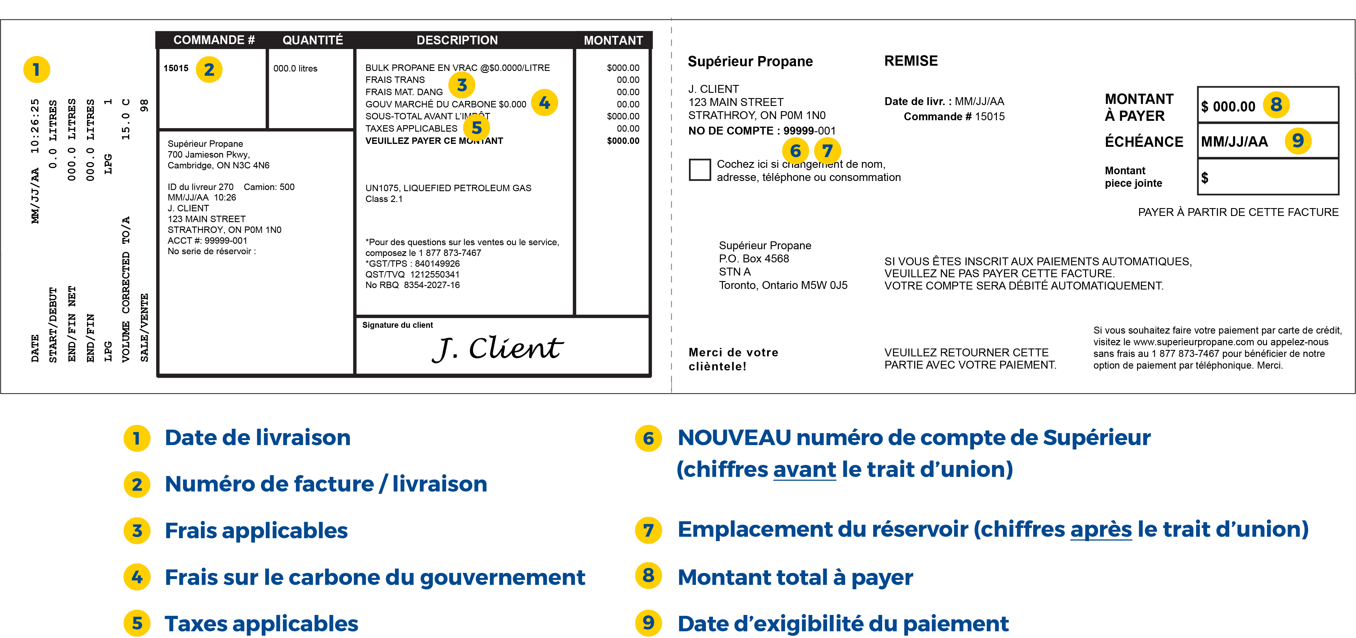 Votre bordereau de livraison (présenté ci-dessous) est également votre facture. Vous pouvez payer votre propane à partir de ce bordereau. Il vous sera remis en mains propres ou laissé à votre attention, par votre livreur, au moment de la livraison de votre propane. Vous en verrez une copie dans monSUPÉRIEURMC. Veuillez noter votre nouveau numéro de compte que vous pourrez utiliser au moment de régler des factures ou de vous renseigner sur votre compte.